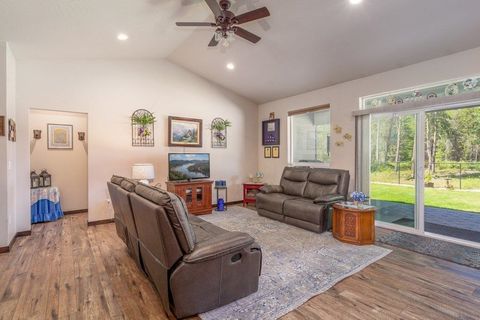 You can be Home for the Holidays to enjoy the tranquility in this stunning Rancher, nestled on a sprawling 5-acres of treed land. This property offers natural beauty & equestrian features providing you with the ideal canvas for your dream lifestyle. The great room seamlessly blends spaces with tons of natural light ~ the perfect setting for gatherings or quiet evenings. Your chef's kitchen boasts top of the line SS appliances including gas range, custom cabinets with lots of storage and walk in pantry. All rooms are extra spacious with wide halls, huge closets & large windows. The 30' X 40' Shop is Extra Special ~ Through access, two awnings both with full RV hook ups, double insulated, plumbed and ready to create a bathroom if desired PLUS it's own propane tank & heater. Relax on your covered patio overlooking the luscious garden, horse corral and gorgeous nature around in your luxurious 6 person hot-tub. This home is in pristine condition & empty of sellers things- ready for yours!