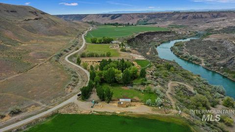 This one-of-a-kind property spans over 20 acres and is nestled along the Snake River. The well-kept grounds with an abundance of shading Willow trees surroundthe home. An irrigated pond flows continuously, creating streams through the property. The artistic structure of the home creates a certain ambiance that can beseen around every corner. A road has been routed to the lower part of the acreage that would make a magnificent building site! Build your dream home facing alarge waterfall across the Snake River! The property currently generates income as an established Equine and Animal Therapy Sanctuary. Call for more details.The 1662 square foot home also has income potential as an Airbnb. Located just 15 minutes from Interstate 84, travel to Boise in 1 1/2 hours or the the ski slope of Sun Valley in less than 2 hours. Plenty of space to store your recreation toys as well as 3 storage sheds. Kayaking, rafting , hunting, fishing, hot springs and the beautiful Hagerman Valley are just minutes away.